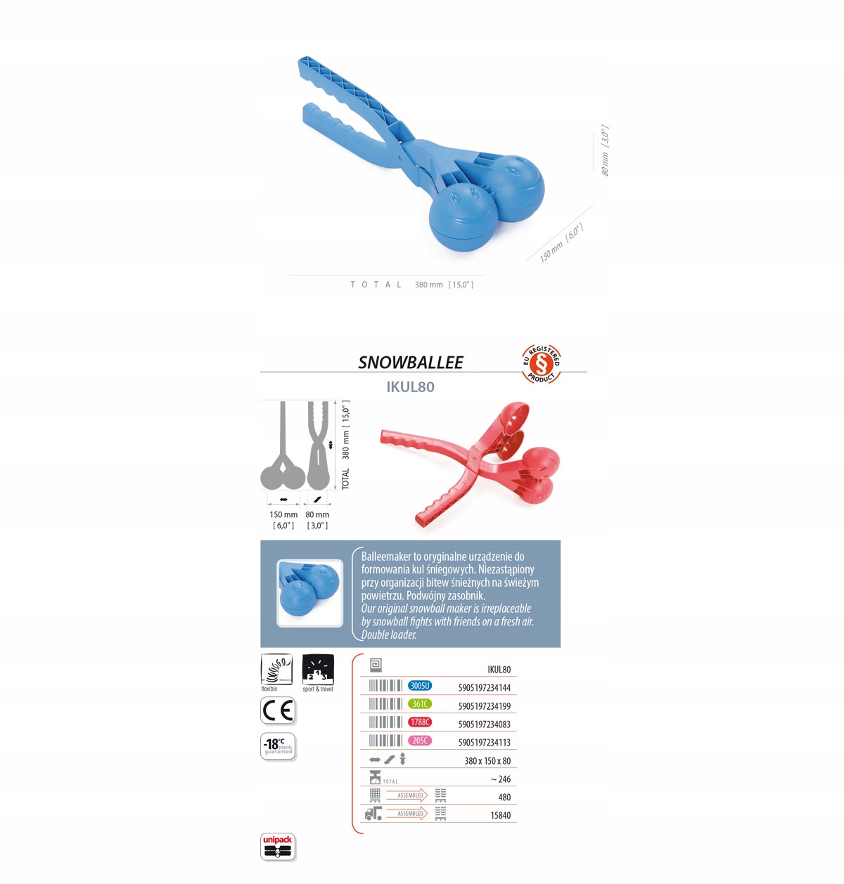 Unikniesz przemoczonych rękawiczek i zmarzniętych dłoni.Wszystkie śnieżki będą równe, okrągłe i w dodatku na każdej odciśnie się uśmiechnięta buźka.Podwójny zasobnik przyśpieszy produkcję śniegowych kul i zwiększy szansę na wygraną! Dzięki Snowballee dzieci wzmocnią swoje zdolności manualne i polubią aktywność na świeżym powietrzu. Śnieżkomat IKUL80 Snowballee to ręczna maszynka do robienia kulek śnieżnych. Śnieżkomat wytwarza dwie śnieżki jednocześnie o średnicy 8 cm. Idealny dla dzieci jak i dla dorosłych.Wymiary:8x11 cm